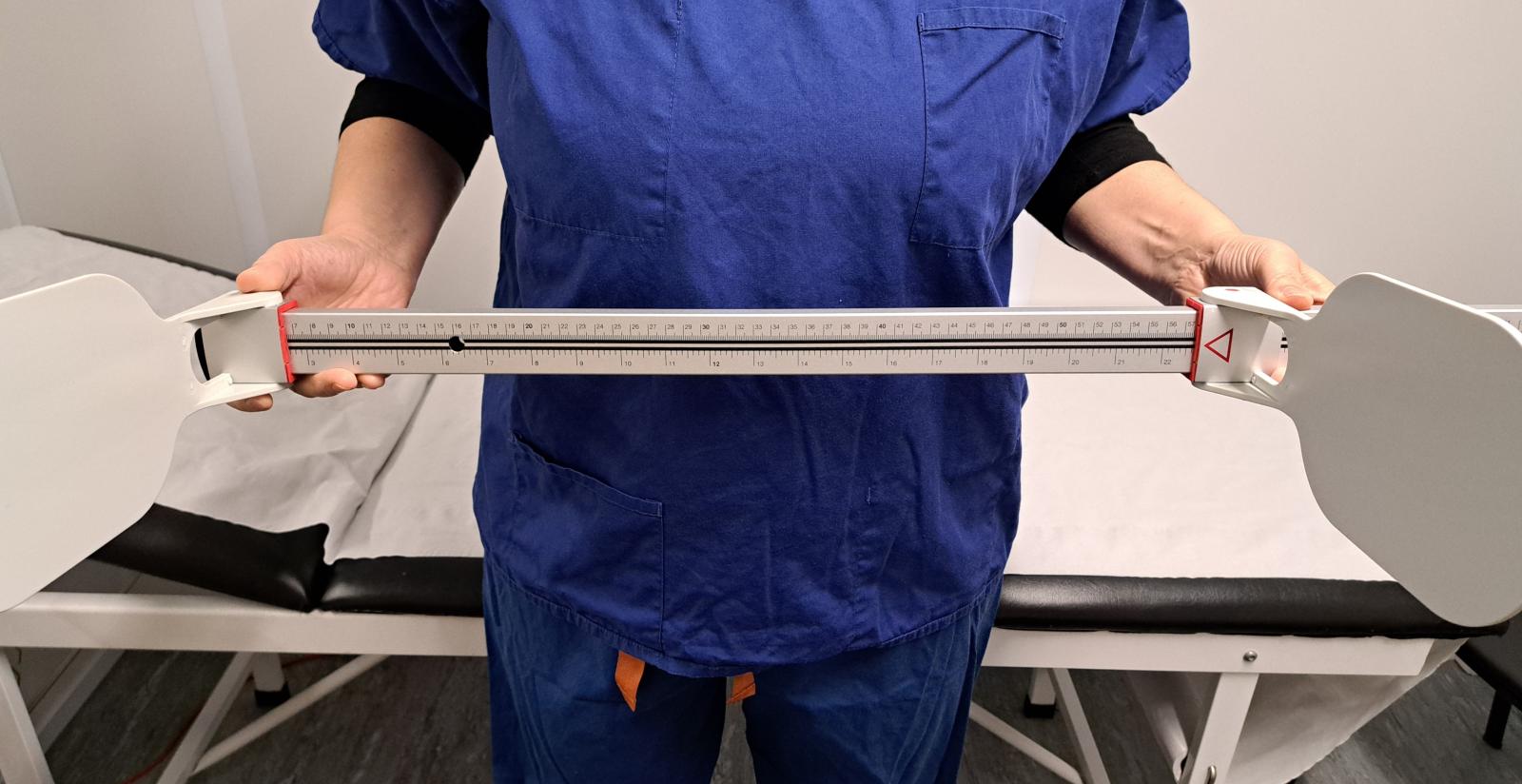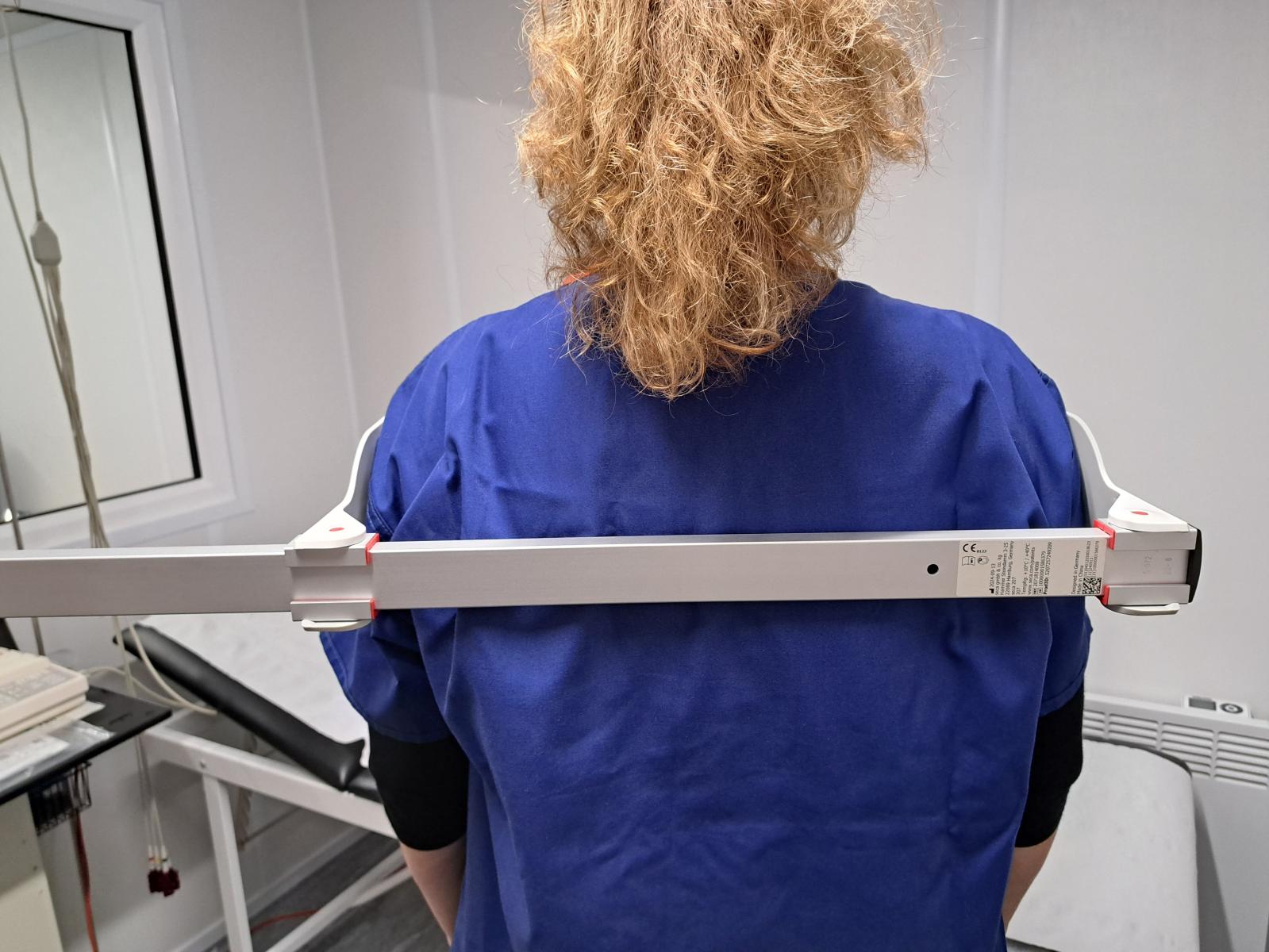 The procedure takes approximately 15 minutes. It involves measuring the distance between the most prominent parts of the shoulders, without wearing any clothing, using a measuring rod.